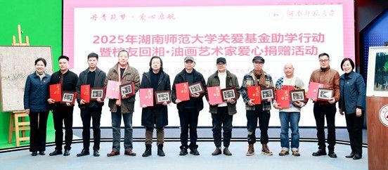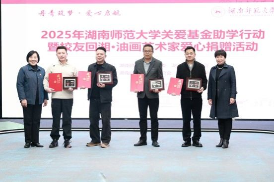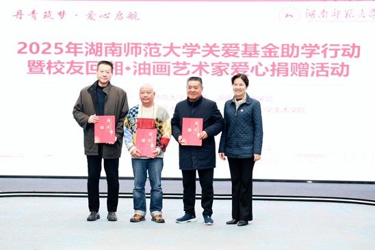 12月22日下午,由校关工委、湖南省油画学会主办,校友总会、美术学院协办的“丹青筑梦 爱心启航”2025年湖南师范大学关爱基金助学行动暨校友回湘•油画艺术家爱心捐赠活动在我校融媒体中心展播厅举行,校党委副书记、关工委主任段巍,关工委常务副主任徐书华出席活动。离退休处负责人尹建新主持活动。